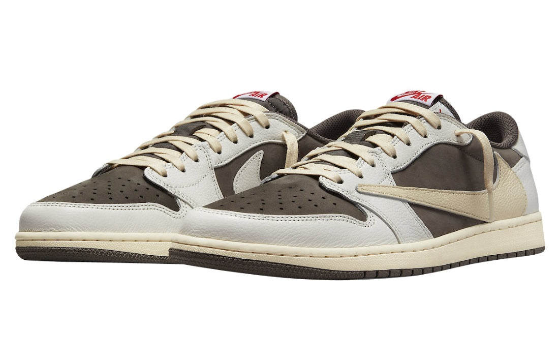 The Travis Scott x Air Jordan 1 Low OG ‘Reverse Mocha’ delivers a twist on the original ‘Mocha’ AJ1 Low from 2019. The upper combines a brown suede base with ivory leather overlays and the Houston rapper’s signature reverse Swoosh on the lateral side, featuring oversized dimensions and a neutral cream finish. Contrasting scarlet accents distinguish a pair of woven Nike Air tongue tags, as well as mismatched Cactus Jack and retro Wings logos embroidered on each heel tab. A vintage off-white rubber midsole is bolstered with encapsulated Nike Air cushioning in the heel and a brown rubber outsole underfoot.
