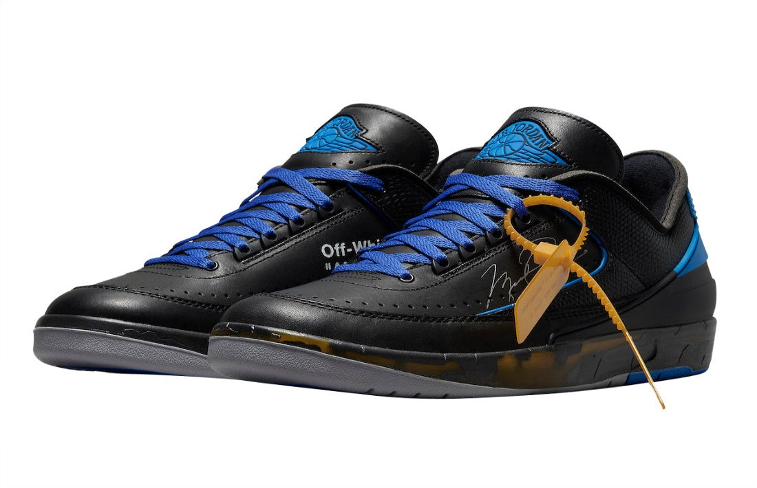 With the release of the Off-White x Air Jordan 2 Retro Low SP 'Black Varsity Royal,' Virgil Abloh gives a relatively unknown silhouette the Virgil Abloh treatment. The low-top is made of black leather with a tonal lizard-textured overlay and royal blue accents. They land on the moulded heel panel, midfoot piping and exposed-foam tongue, featuring the Jordan Wings logo for an OG touch. Michael Jordan's signature is scrawled across the lateral side, while Virgil Abloh stamps the laces with a plastic zip tie, medial-side Helvetica text, and the text 'SHOELACES'.