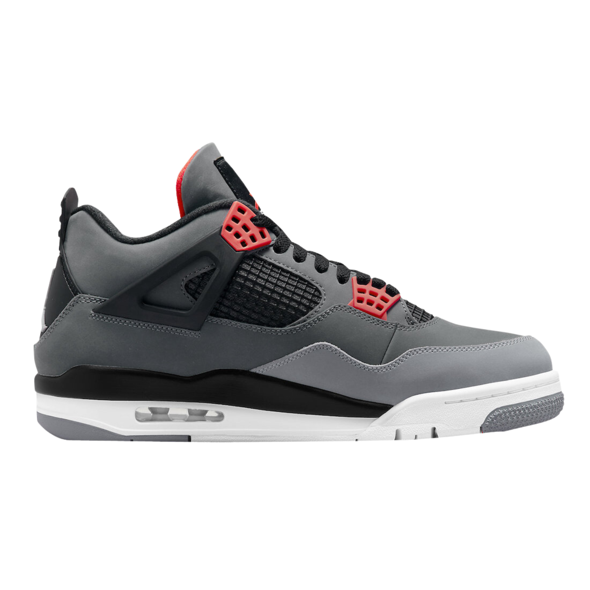 The Air Jordan 4 Retro "Infrared" features distinctive color blocking that recalls the "Green Glow" AJ4 release from 2013. The upper is crafted from smooth nubuck in a charcoal finish. Also, a lighter shade of grey distinguishes the forefoot overlay, while black accents land on the quarter panel netting, structural wings and Jumpman-branded heel tab. Underfoot, the midsole is dressed in a two-toned monochromatic look that goes well with the rest of the shoe’s colourway. Rounding off the Air Jordan 4 Infrared is an understated white and grey outsole.