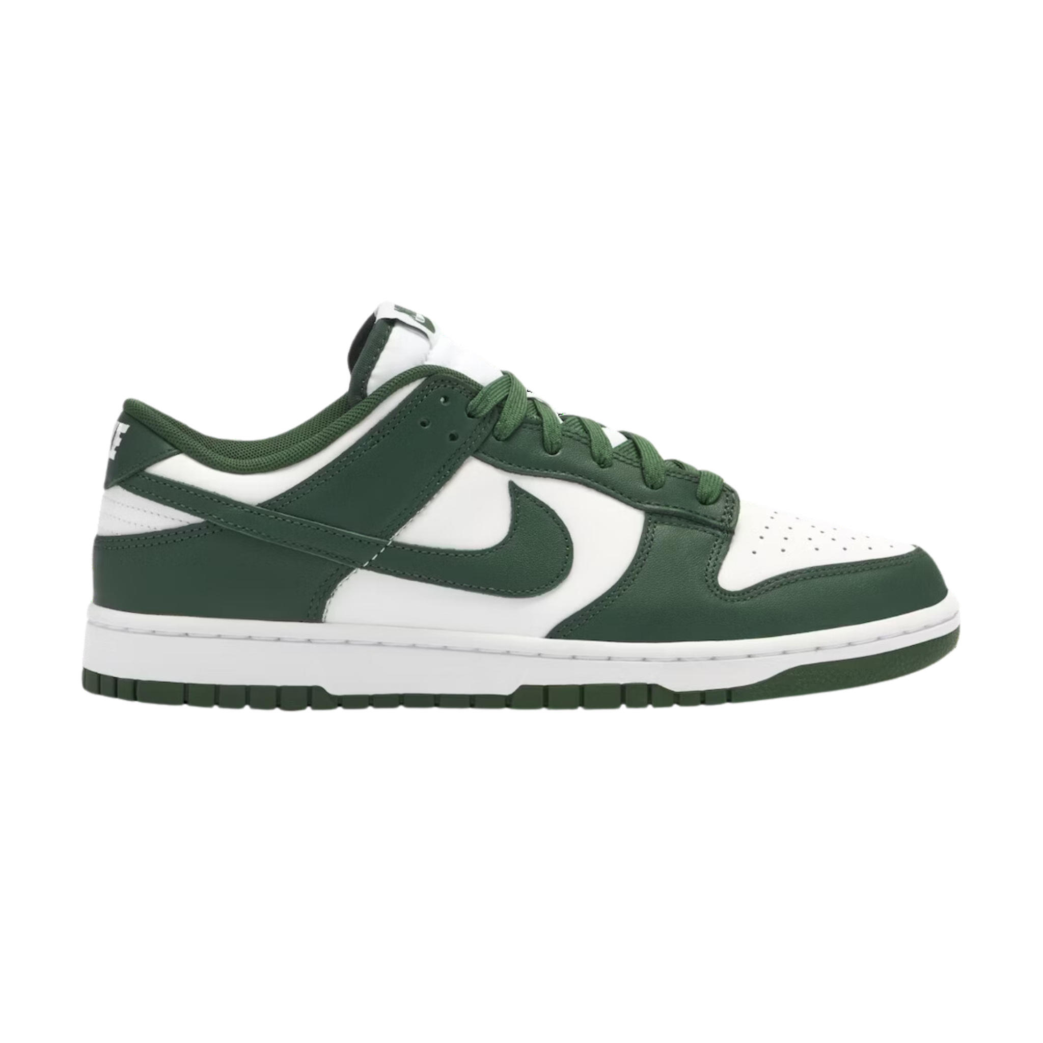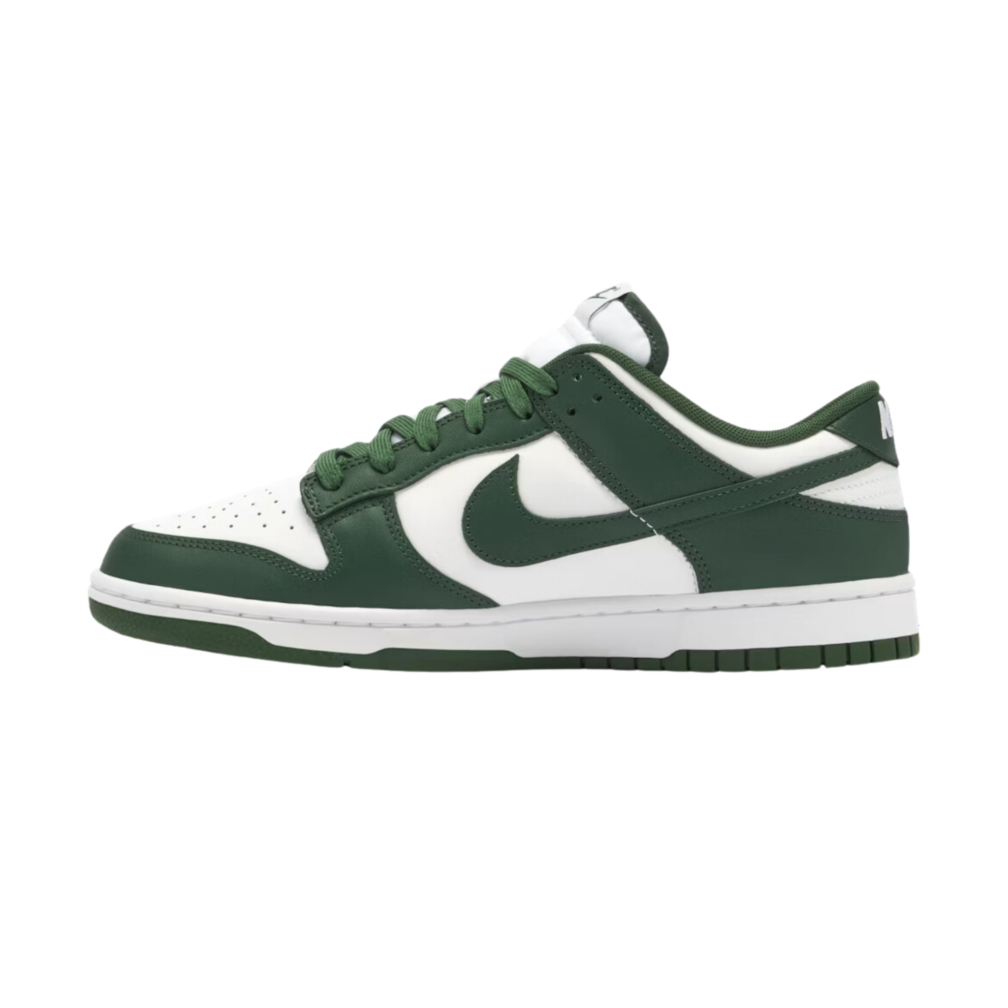 The Nike Dunk Low 'Michigan State' is a low-top version of the 2020 Michigan State Dunk. Like its predecessor, the shoe sports a two-tone leather upper with 'Be True to Your School' color blocking. In contrast to the all-white finish, a dark green Swoosh and matching overlays at the toe and heel stand out. The nylon tongue and heel both feature the Nike logo. The low-top is constructed with a durable rubber outsole that has a grip pattern specifically made for hardwood flooring.