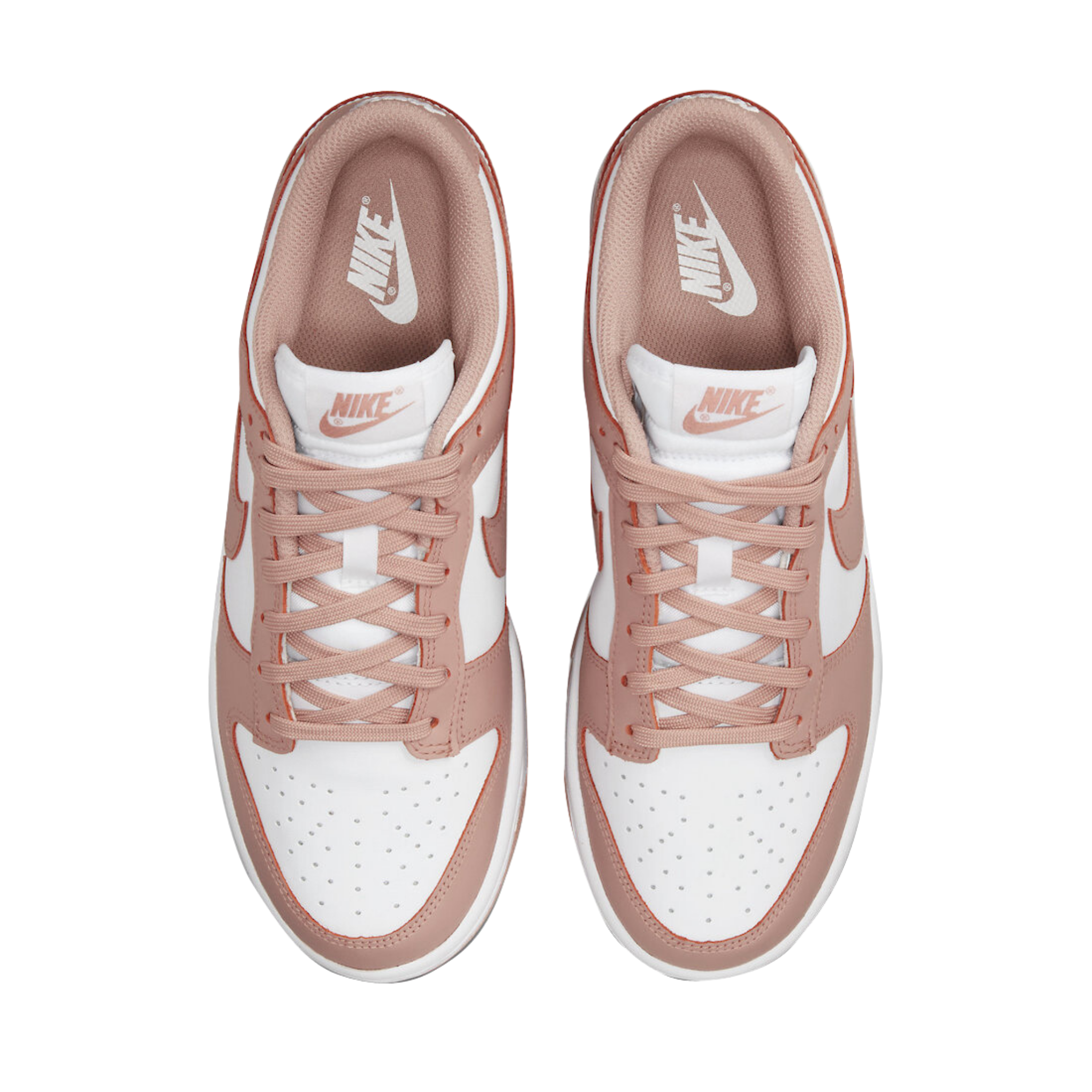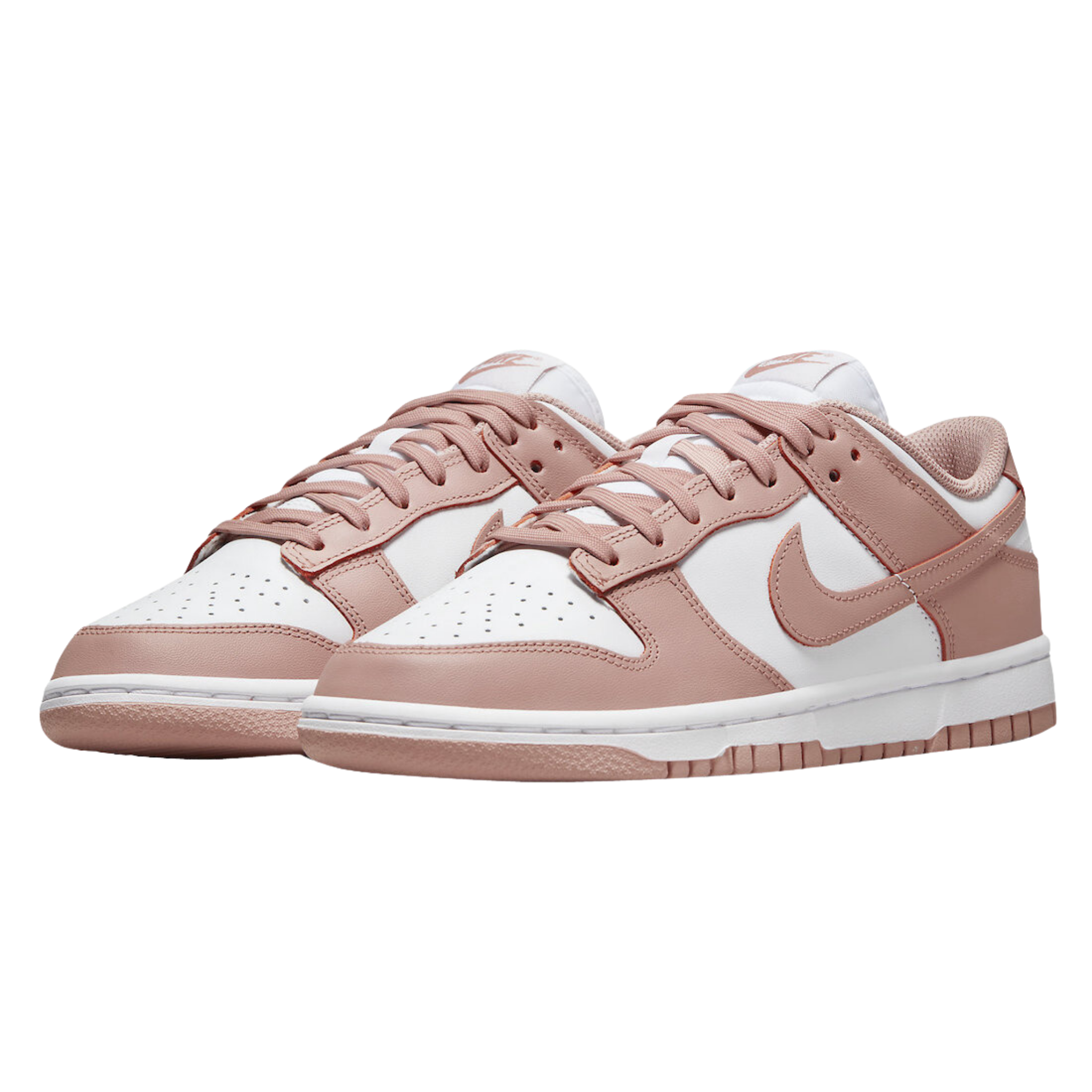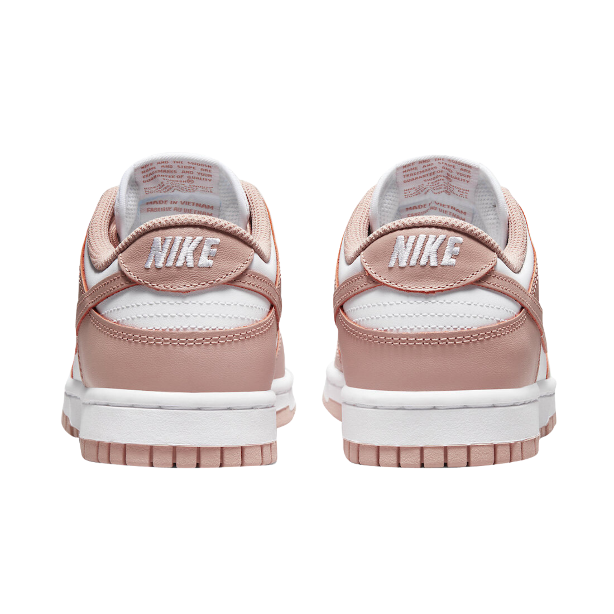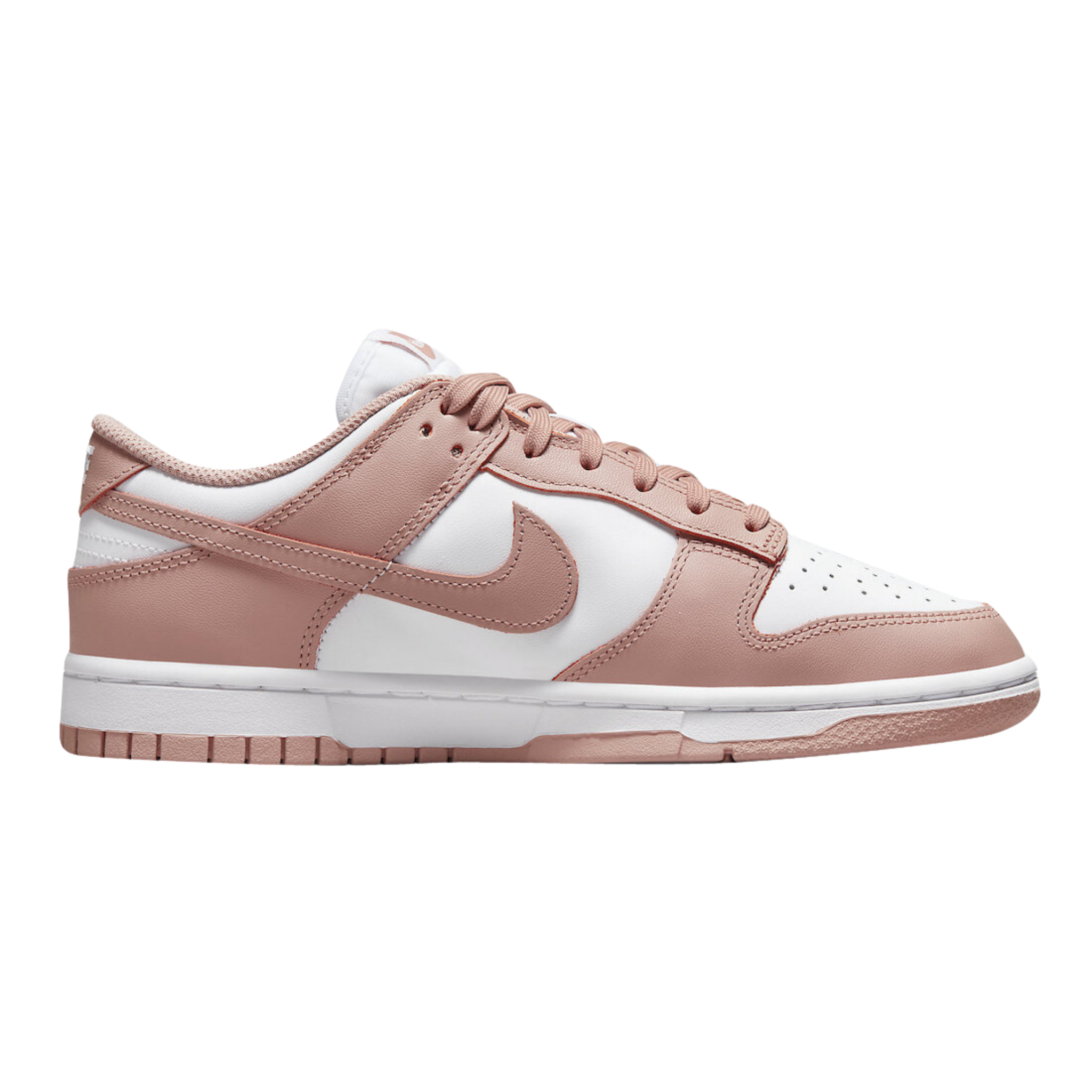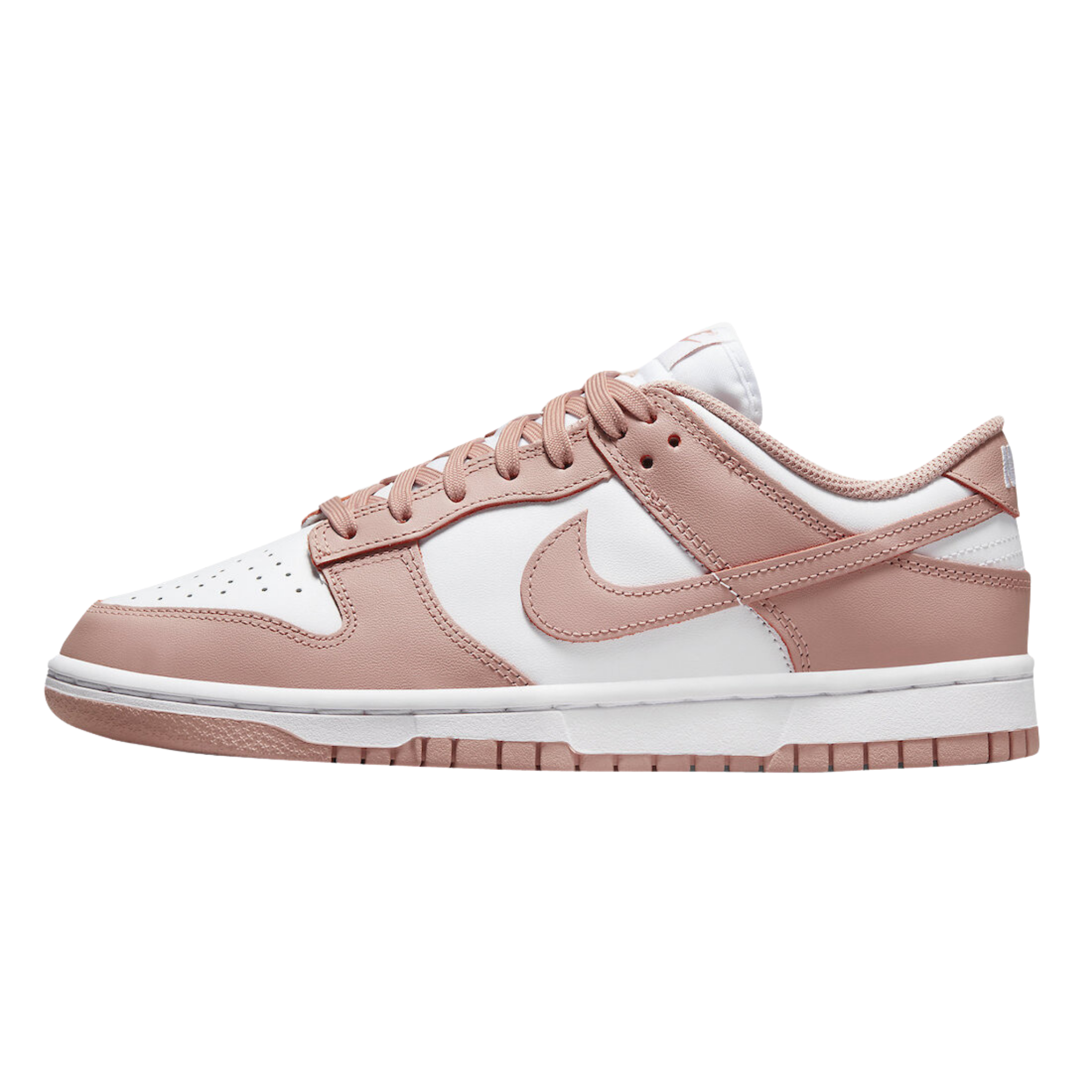 The Nike women's Dunk Low 'Rose Whisper' adds a soft color palette to the vintage basketball shoe, which first appeared on college courts in 1985. The low-top features an all-leather upper with a clean white base and contrasting overlays in a soft peach hue. A padded collar with a low cut provides a comfortable fit, while a nylon tongue and perforated toe box increase airflow. Anchoring the retro silhouette is a traditional two-tone rubber cupsole.