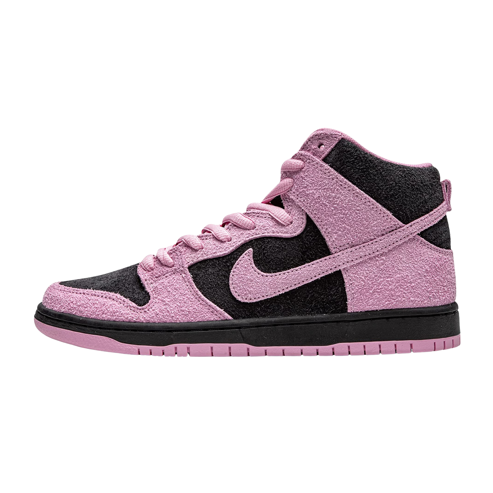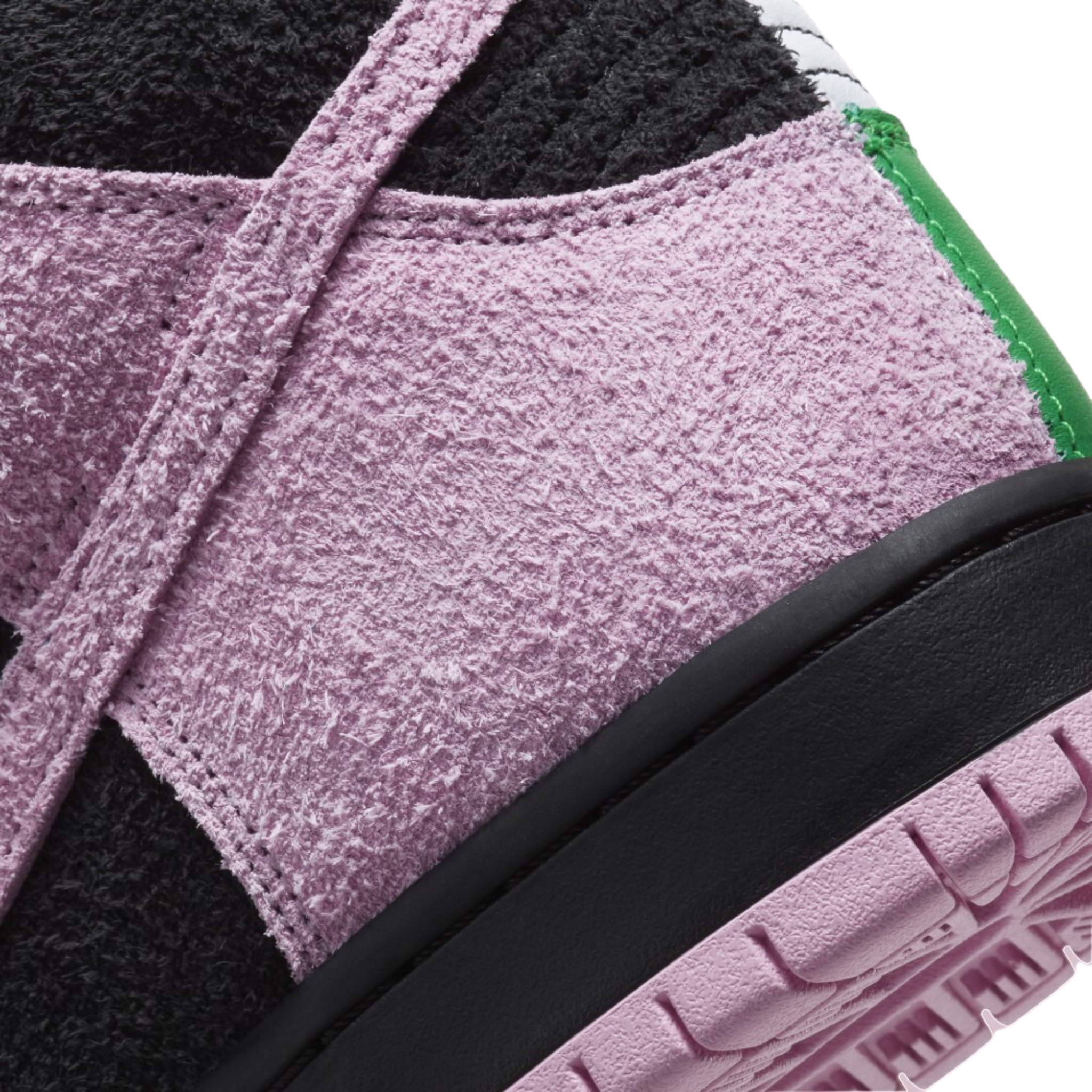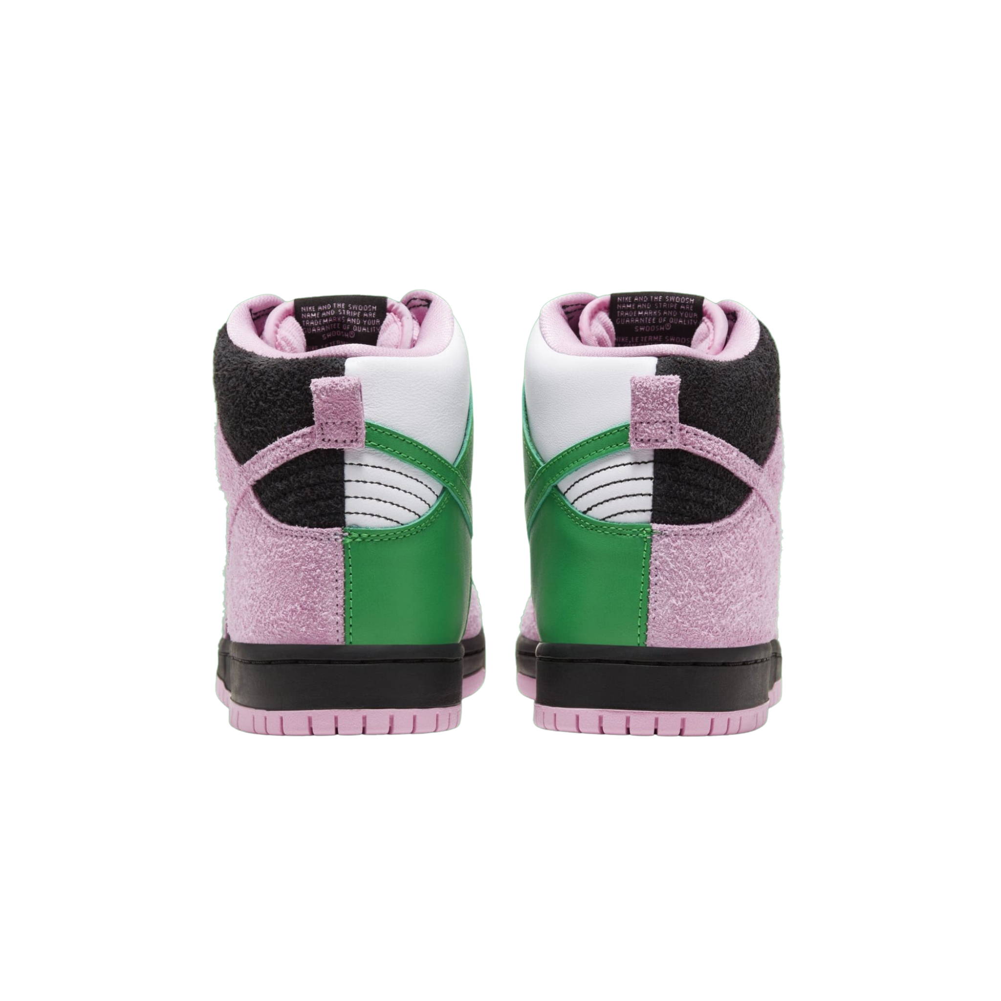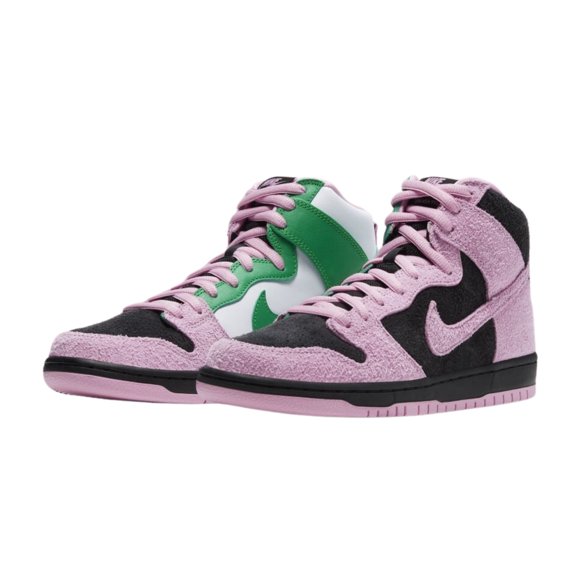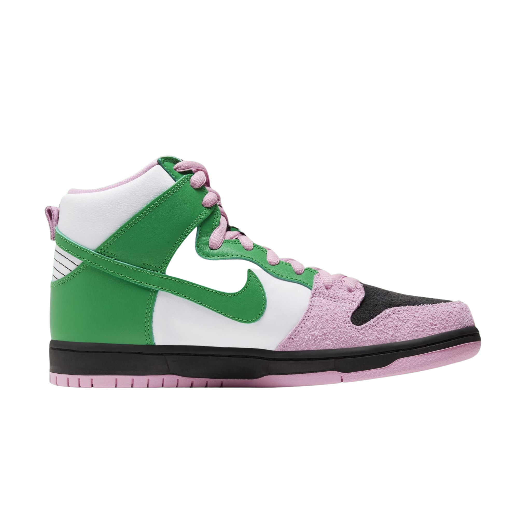 The Nike SB Dunk High Invert Celtics shoe features a black, Pink Rise, and Lucky Green suede and premium leather upper, with the rough suede taking on both black and pink hues on one side of the shoe and smooth leather with green and white tones adorning the opposite side. From there, pink laces, the "Swoosh" logo in the same pink shades, and printed insoles complete the design.