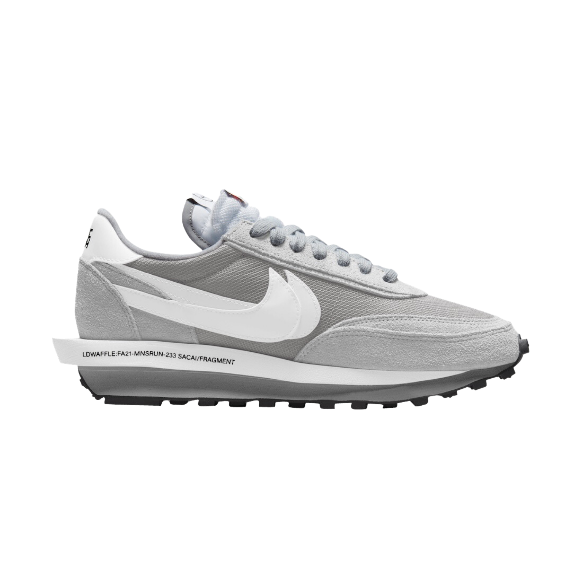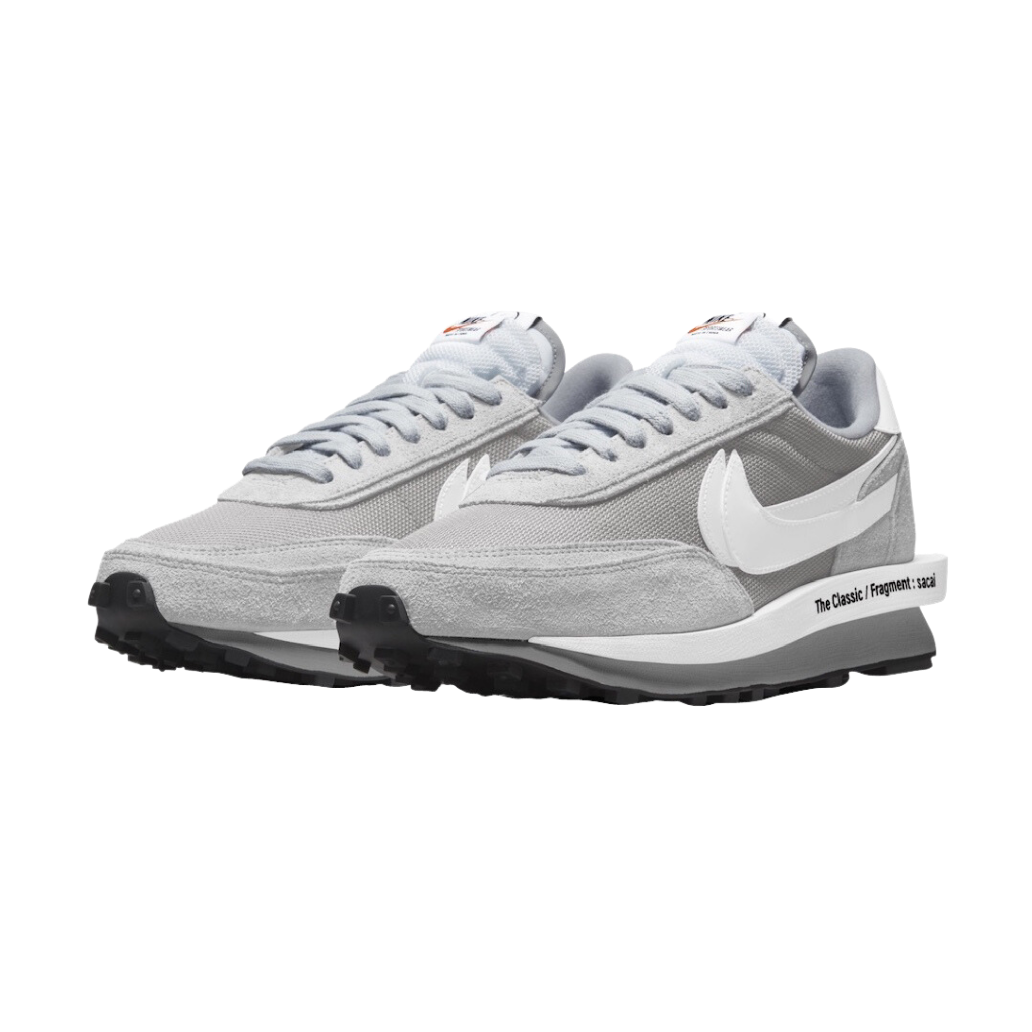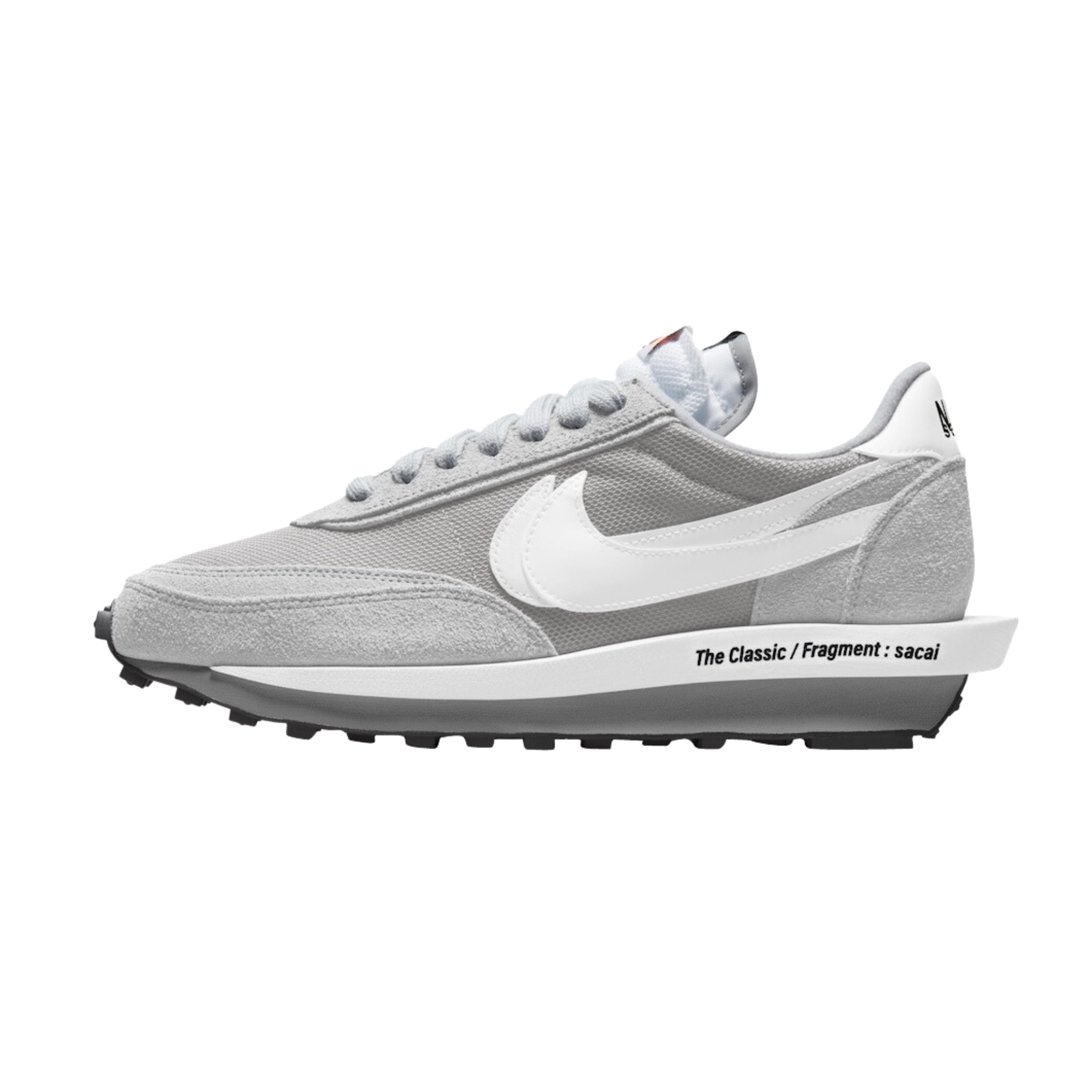 The Fragment Design x sacai x Nike LDV Waffle ‘Light Smoke Grey’ brings together Chitose Abe and Hiroshi Fujiwara on a three-way sneaker collaboration that borrows elements from the Nike LDV and Waffle Racer. In keeping with sacai’s signature aesthetic, the upper is crafted from grey mesh with double-stacked tonal suede overlays along the forefoot, heel and eyestay. The white leather Swoosh, laces and tongue are similarly doubled up, with the latter featuring Nike and Fragment woven tags. Additional branding includes printed text on the elongated foam midsole that reads ‘The Classic / Fragment: sacai.’ Underfoot, a waffle-traction rubber outsole delivers reliable grip.